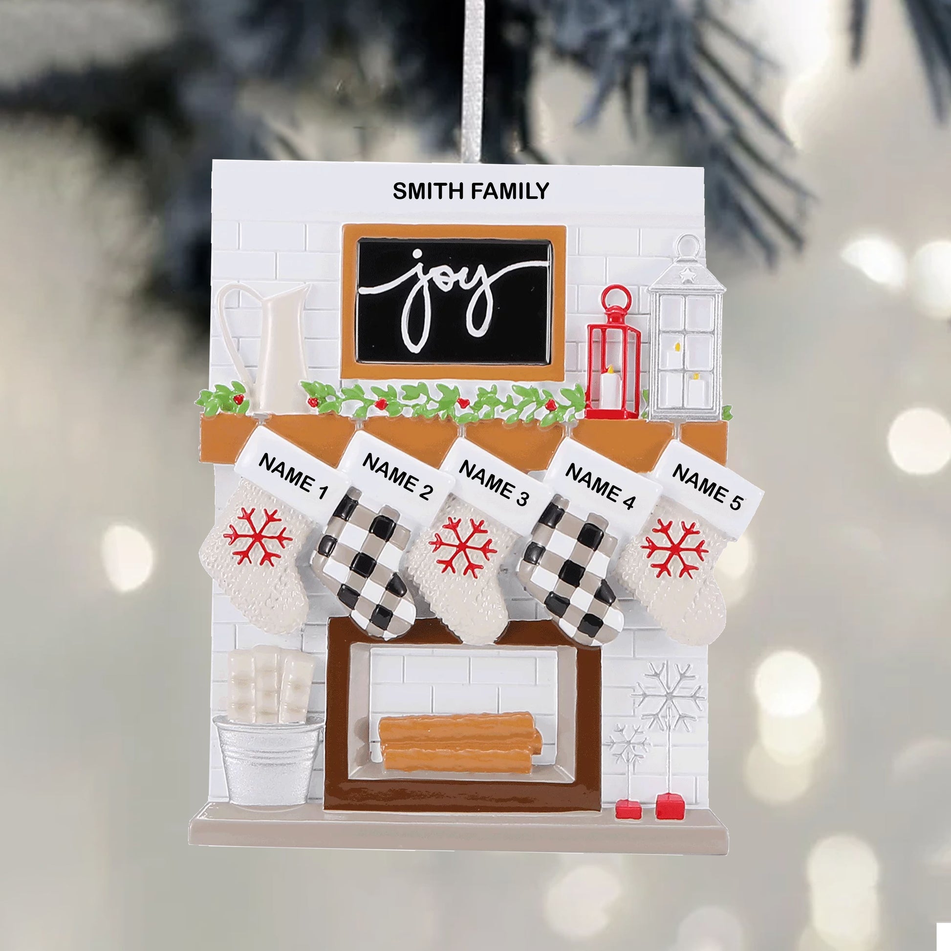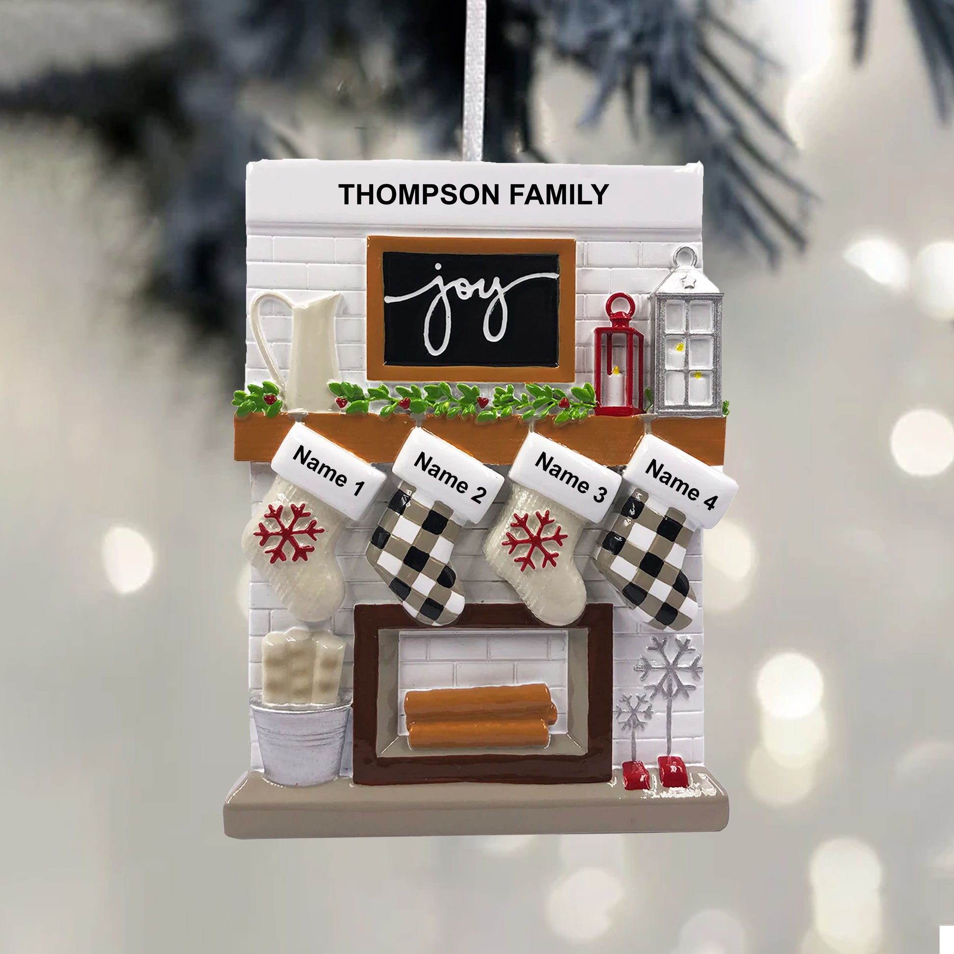 Celebrate the love and joy of family this Holiday season with the Fireplace Stockings Personalized Family Ornament.
